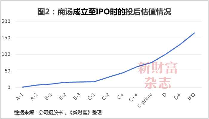 2021年8月,商汤向港交所递交招股书,12月完成IPO,募资净额55.52亿港元,发行价对应市值约1280亿港元,折合164亿美元,较IPO前最后一轮估值的增幅是26%。