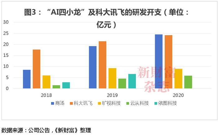 至2020年,商汤24.5亿元的研发开支规模不仅在“AI四小龙”中大幅领先,甚至反超了科大讯飞这一A股AI标杆企业(图3)。2018-2023年,商汤的研发费用合计支出高达163亿元,同时在销售、管理费用方面的总支出为118亿元,合计占其总融资额的比例接近七成。