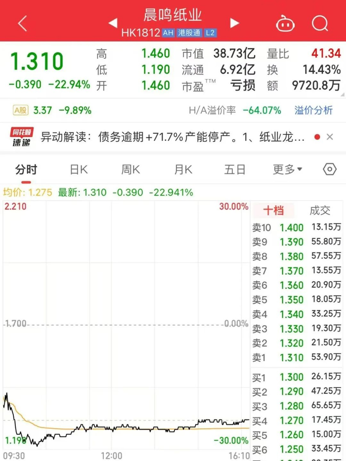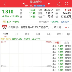 11月20日,晨鸣纸业股价暴跌,港股方面,晨鸣纸业开盘一度跌停,收盘跌超22%。