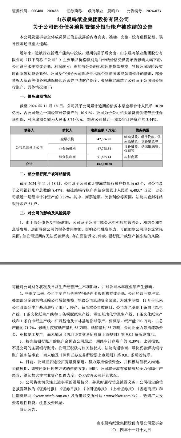 11月19日晚间,纸业龙头晨鸣纸业发布公告,披露了公司部分债务逾期暨部分银行账户被冻结的情况。