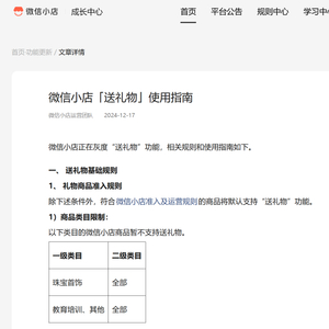 12月18日深夜,微信团队公告,微信小店正式开启“送礼物”功能的灰度测试,除珠宝、教育培训类目,且商品款式原价不得高于1万元的商品将默认支持“送礼物”功能。
