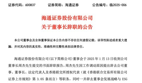 周杰辞职总经理李军代为履职公告显示,2025年1月13日,周杰向公司董事会提交了书面辞职报告,因工作调动原因,辞任公司董事、董事长、法定代表人及香港联交所授权代表等职务,同时一并辞去董事会发展战略与ESG管理委员会主任委员职务,其辞职之后将不再担任公司任何职务。在周杰辞职后,海通证券董事会作出决议,由公司董事兼总经理李军代为履行董事长、董事会发展战略与ESG管理委员会主任委员以及法定代表人职责。同时,委任李军担任香港联交所授权代表。海通证券表示,周杰的辞职未导致公司董事会成员低于法定最低人数,不会影响公司董事会的正常运作,辞职报告自送达公司董事会时生效。任期内推动多项战略规划周杰于2016年7月加入海通证券,并于2016年10月起担任海通证券董事长。在任期内,周杰推动了多项战略规划。公告指出,周杰在任期间带领海通证券紧抓服务国家战略和实体经济主线,主动融入新发展格局,推动培育新质生产力,成为国家战略的重要践行者和金融改革的重要探索者;把握资本市场改革机遇,通过A股股票非公开发行,募集资金总额200亿元人民币,进一步增强了资本实力,为海通证券业务的拓展延伸和转型升级夯实了基础;秉持以客户为中心的“12345 战略”,深入践行“一个海通”理念,通过深化“投、融、保、研”及财富管理业务的协同联动,不断提升金融服务实体经济和社会的质效。在加快建设金融强国和上海国际金融中心的大背景下,周杰带领海通证券积极推进与国泰君安的合并工作,致力于通过强强联合、优势互补,打造一流投资银行。海通证券表示,公司董事会将继续推进与国泰君安的合并工作,强化功能定位,对标国际一流,加快向具备国际竞争力与市场引领力的投资银行迈进,为资本市场、证券行业创新发展注入强劲动力。2025年首个并购重组过会案例1月9日,国泰君安、海通证券发布公告,宣布本次合并重组获得上海证券交易所并购重组审核委员会审核通过,这也是2025年首个成功过会的并购重组项目。后续,按照行政审批程序,两家公司将向中国证监会提交注册申请。国泰君安与海通证券合并重组,是新“国九条”实施以来头部券商合并重组的首单,也是中国资本市场史上规模最大的A+H双边市场吸收合并、上市券商最大的整合案例。此次合并重组被视为具有标杆和示范意义的典型案例,是打造国际一流投行的重要举措。编辑:赵新亮校对:王玥制作:舰长审核:许闻