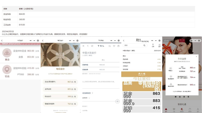 具体而言,周大福足金(首饰、摆件类)、六福珠宝足金999/足金、潮宏基足金(首饰摆件)、周生生足金饰品、谢瑞麟足金饰品当日公开的境内价格为863元/克,老庙黄金上海区域足金饰品价格达864元/克。