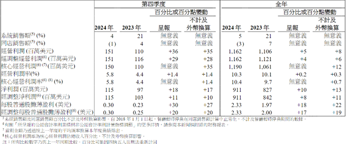 近日,百胜中国(09987.HK)发布第四季度及全年业绩。具体来看,公司2024年第四季度销售额同比增长4%,经营利润同比增长36%达到1.51亿美元,经营利润率为5.8%,同比增长140个基点;2024全年,百胜中国总收入同比增长3%至113亿美元,创分拆上市以来新高;经营利润同比增长5%至12亿美元。