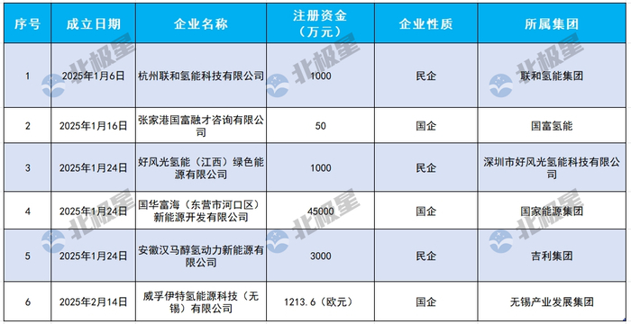 2025年开年来,已有多家氢能企业成立,其中有6家实力雄厚,股东涉及国家能源集团、国富氢能、吉利集团等,各集团纷纷加深氢能业务布局,加快氢能产业发展。
