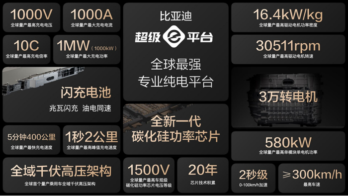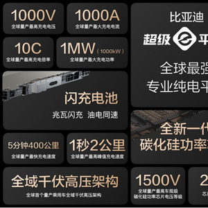 3月17日,比亚迪汉L EV正式开启预售,预售价为27-35万元。新车最大的亮点是搭载超级e平台技术,全域千伏架构,支持1000V最高充电电压、1000A最大充电电流、10C最高充电倍率、1000kW最大充电功率,5分钟续航增加400公里,电机最大功率580kW,最高转速达到3万转,零百加速2秒级等等。