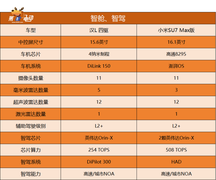 智能驾驶方面,两款车均达L2+级别,而且都支持高速和城市NOA功能。不同之处在于两车的硬件配置,汉L搭载了1颗英伟达Orin-X芯片,而小米SU7搭载了2颗英伟达Orin-X芯片,算力达到了508 TOPS。另外,汉L比小米SU7多了2颗毫米波雷达。