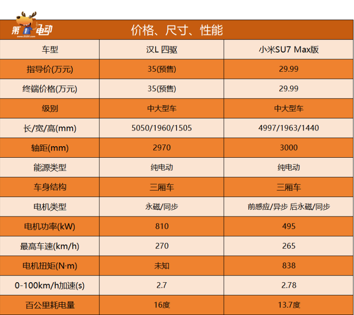 在最关键的价格方面,汉L四驱版的预售价高达35万,比小米SU7 Max版足足高了5万元,但这不是最终的售价,等上市的时候,汉L的价格肯定会下调,预计四驱版会来到30万左右,基本与小米SU7 Max持平。