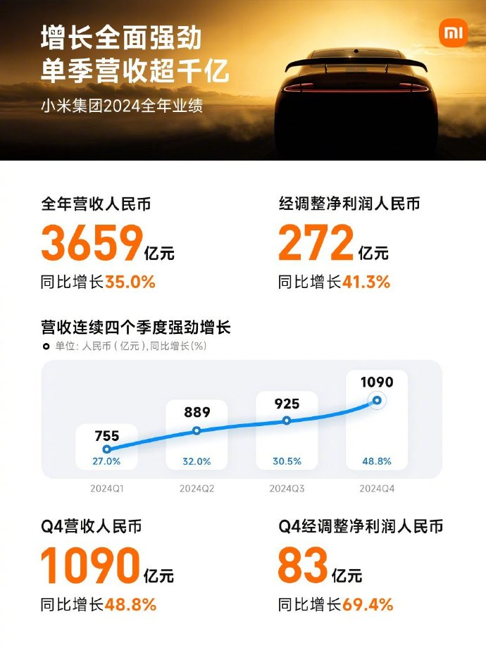 3月18日,小米集团在港交所公告,2024年营收3659.06亿元,创历史新高,同比增长35%;经调整净利润为272亿元,创历史新高,同比增长41.3%,其中包括智能电动汽车等创新业务经调整净亏损62亿元。
