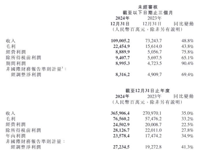 据公告,2024年第四季度,集团总收入首次单季度突破1000亿元,达到1090亿元,创历史新高,同比增长48.8%。2024年第四季度,集团经调整净利润为83亿元,创历史新高,同比增长69.4%。其中包括智能电动汽车等创新业务经调整净亏损7亿元。