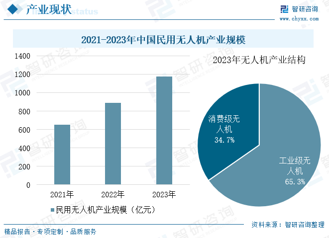 近年来,中国无人机产业正以惊人的速度发展,产业链愈发成熟,应用领域不断扩大,已成为低空经济发展的新亮点,在全球市场上占据了举足轻重的地位。数据显示,2021-2023年中国民用无人机产业规模以两位数增幅保持快速增长态势,2023年产业规模达1174.3亿元,同比增长32%。其中,工业级无人机为市场主要类型,2023年规模占比65.3%。相较于消费级无人机,工业无人机具有单机价值量高、功能强大、应用场景广泛等特点,随着技术的不断成熟和通航政策的逐步放开,工业级无人机应用场景日益广泛,涵盖了应急救援、物流配送、遥感测绘、电力巡检等多个领域,工业级无人机在未来依旧将占据市场主要份额。