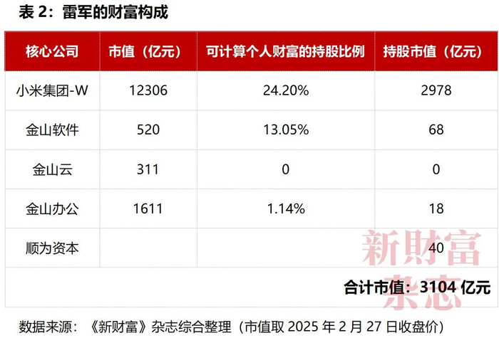据《新财富》杂志测算,本次配售前,雷军合计持有小米集团24.2%的股权,按2025年2月27日收盘价计算,其在小米集团中的持股市值2978亿元,在金山软件中的持股市值68亿元,在金山云中的持股市值为0,在金山办公的持股市值18亿元,加上价值约为40亿元的顺为资本,雷军总身家大概为3104亿元(表2)。
