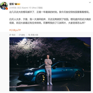 同日,话题“雷军小米YU7樱花照”冲上热搜。