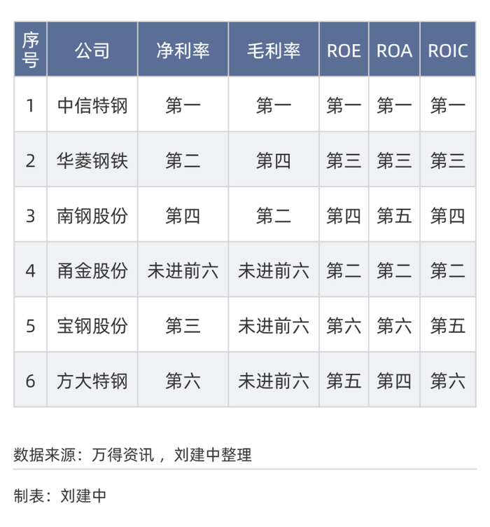 表3: 主要钢铁企业的净利率、毛利率、ROE、ROA、ROIC排名
