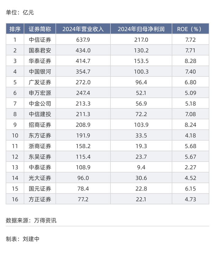 A股共有49家证券公司,目前已有29家公布了2024年财务数据,其中16家营业收入超过了70亿元。在这16家中,中信证券的净资产收益率(ROE)为7.72%,位列第四。