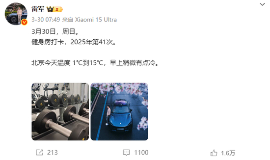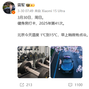 3月30日早晨7点49分,雷军忙着在健身房打卡: