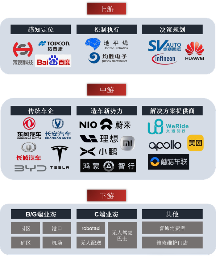 (2)整车制造商:①传统车企:丰田(TRI-AD)、大众(CARIAD)、通用 Cruise;新势力:特斯拉、比亚迪、蔚来、小鹏、理想、小米等。
