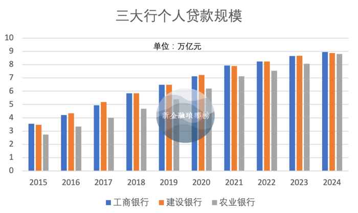 截至去年末,工行、建行、农行的个人贷款规模分别为8.96万亿元、8.87万亿元、8.81万亿元,工行再次超越建行位居首位,农行距离建行不过毫厘之间。