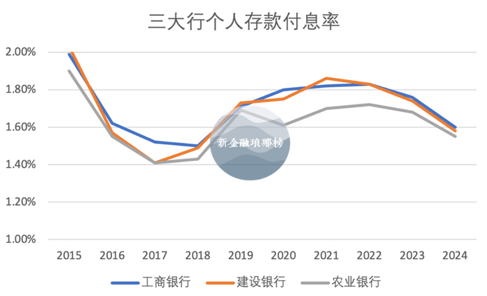 更重要的是个人存款平均付息率,去年工行、建行、农行分别为1.60%、1.58%、1.55%,农行依然最优,领先优势却收缩到近年来最低——2020年,农行付息率一度比工行低19BP,比建行低14BP。