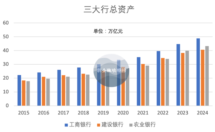 截至2024年末,工行、建行、农行总资产分别为48.82万亿元、40.57万亿元、43.24万亿元,同比分别增长9.23%、5.86%、8.44%。