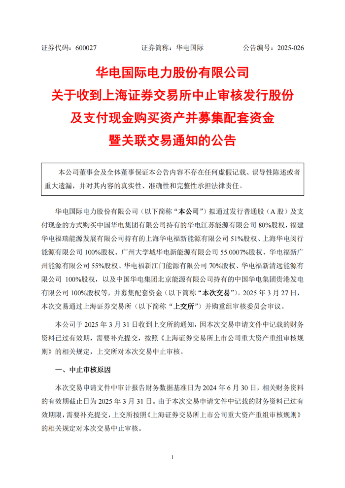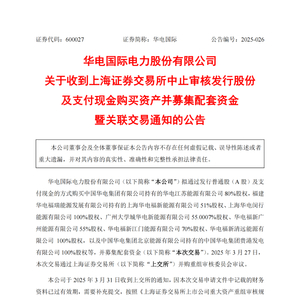近日,华电国际电力股份有限公司(以下简称“华电国际”)发布公告。公告显示,华电国际收到了上海证券交易所中止审核其发行股份及支付现金购买资产并募集配套资金暨关联交易的通知。