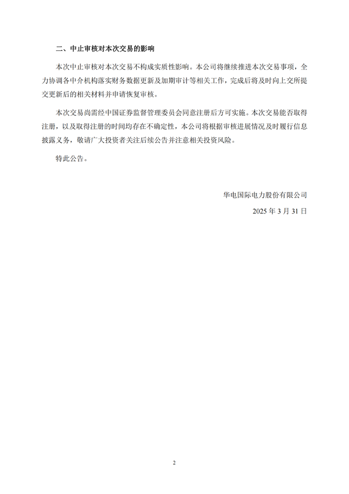不过,由于财务资料已过有效期,导致交易审核被中止。但华电国际表示,将继续全力推进本次交易事项,积极协调各中介机构落实财务数据更新及加期审计等相关工作。一旦完成,将及时向上交所提交更新后的相关材料并申请恢复审核。