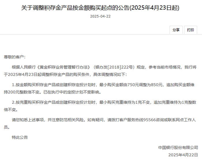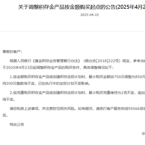 不过,由于近期金价涨幅较大,也有部分银行开始上调积存金的购买起点。例如中国银行,就在4月22日发布公告称,将从4月23日起,将金额购买积存金产品的最小购买金额由750元调整为850元,追加购买金额维持200元整数倍不变。