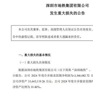 4月29日,深圳市地铁集团有限公司(下称“深铁集团”)发布重大损失公告。公告显示,根据2024年度审计报告,深铁集团2024年合并报表范围内发生亏损334.61亿元。截至2023年末,该集团净资产为3164.31亿元,2024年度合并报表范围内发生亏损占2023年末净资产比例为10.46%,超过10%。