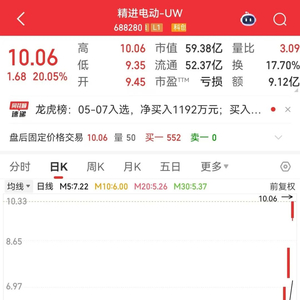 5月7日,精进电动-UW(688280)再次收获“20cm”涨停。截至收盘,该股已连续录得4个涨停,短短4个交易日内股价累计上涨107.42%,涨幅排名同期A股第一位。从过往走势可以发现,在本轮大涨之前,精进电动-UW股价处在历史低位附近,股价不足5元/股,A股市值不到30亿元。