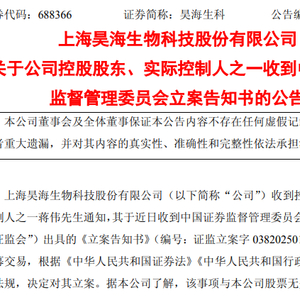 5月7日晚间,昊海生科(688366)公告称,公司控股股东、实际控制人之一蒋伟近日收到中国证券监督管理委员会出具的立案告知书,因涉嫌内幕交易对其进行立案调查。