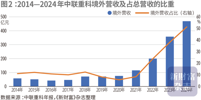 2020年之前,中联重科境外营收维持在25亿至38亿元之间;2020年之后快速上行,2024年达到233.8亿元,4年复合增长率高达57.2%,对其总营收的贡献由5.89%上涨至51.41%(图2)。