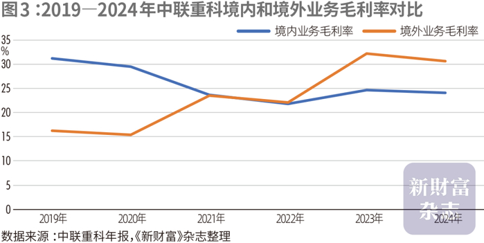 更重要的是,其境外业务的毛利率持续攀升,2023年、2024年均高于境内业务(图3)。