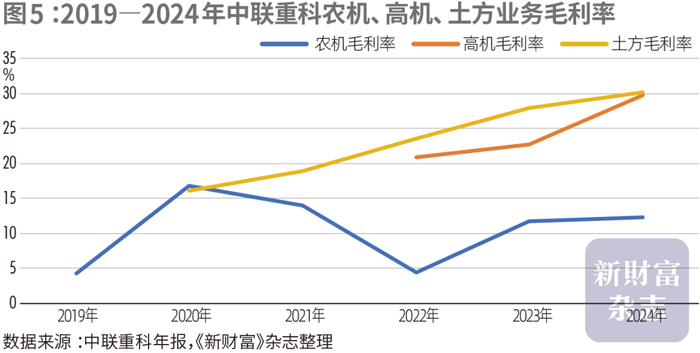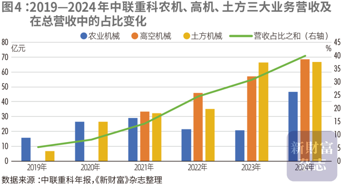 2019—2024年,中联重科的土方机械营收实现8.6倍的增长,农机实现近两倍的增长,高机则在4年内实现翻倍,三大业务营收之和在总营收中的占比由5.27%上涨至39.92%(图4)。
