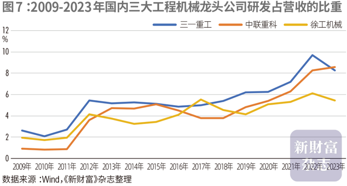 2023年,中联重科研发支出40.34亿元,占总营收的比重达到8.57%,高于三一重工的8.24%和徐工机械的5.43%(图7)。2024年末,中联重科研发人员首次突破万人至10724人,占总员工人数的33.74%,为历史最高。显然,尝到境外业务高速发展甜头的中联重科,将更多的筹码放在研发上。
