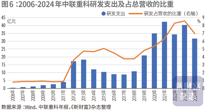 技术底座的搭建,离不开中联重科持续不断的研发投入。2011年之后,其研发投入比例显著提升。2018年之后,随着数字化转型、新能源产品研发、智能化升级,其研发投入再次大幅增加(图6),2018—2024年研发投入合计215.44亿元,占2006年以来总研发投入302亿元的71%。