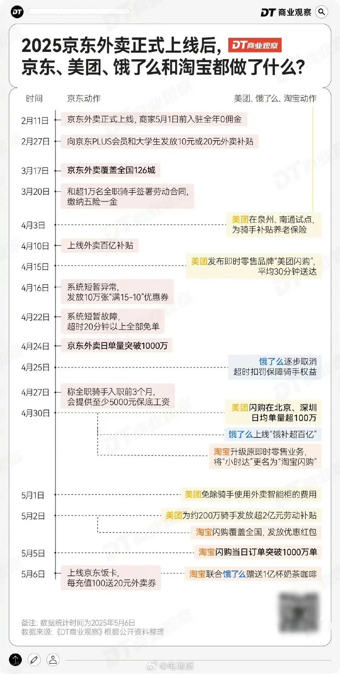 而身经百战的饿了么则在隔岸观火之后,启动“饿补超百亿”活动,随后阿里将淘天旗下即时零售业务淘宝“小时达” 升级为淘宝 “闪购”,先在 50 多个城市上线,并将在 5 月 6 日覆盖全国。从数据来看,淘宝闪购上线后,单日订单量迅速突破1000万。