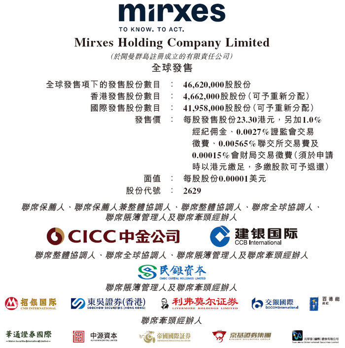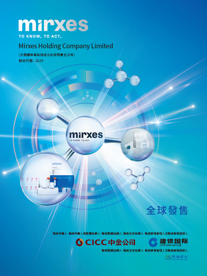 MIRXES是次IPO,中金公司、建银国际为其联席保荐人、整体协调人、联席全球协调人,民银证券为其为其整体协调人、联席全球协调人,其他包销商包括招银国际、东吴证券国际、利弗莫尔证券、交银国际、百德能经纪、华通证券、中源国际、帝国国际证券、京基证券、元宇宙国际证券。