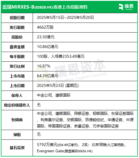 觅瑞 MIRXES-B(02629.HK),于今日(5月15日)起至下周二(5月20日)招股,预计2025年5月23日在港交所挂牌上市,中金公司、建银国际联席保荐。