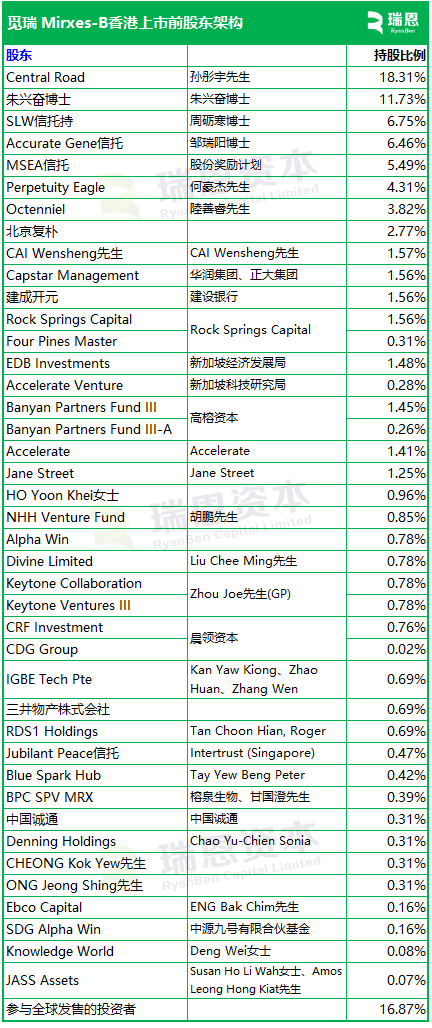 招股书显示,MIRXES在上市后的股东架构中,前淘宝总裁孙彤宇先生,持股18.31%;朱兴奋博士持股11.73%;参与全球发售的股东持股16.87%。