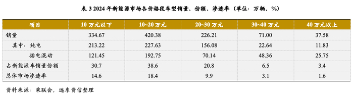 从销售价格走势来看,2024年以来,中国新能源汽车整体销售价格整体承压。从新能源市场各价格段车型销量、份额、渗透率来看,国内新能汽车主要集中在30万元以下车型。其中10万元以下和10~20万元车型销量相对较高,主要销售产品动力类型以纯电车型为主,具体来看目前,20万元以下汽车产品中A00、A0和A级等低价、小尺寸车型市场份额呈逐年增长态势,2024年上述三种车型的全市场渗透率分别达到5.5%、4.3%和10.6%,合计销量约占当年新能源汽车的43%。同时,插电混动系统要求主机厂在配置电池包之外另行配置燃油动力系统或发电机,在性价比、整车尺寸和客户定位方面均与A级车定位存在明显差异,因此20万元以下车型中插电混动车型占比偏低。30万以上车型中SUV占比较高,车载空间更大,插电混动系统在大幅提升续航里程的同时也降低了车主对大容量高成本电池系统的诉求,因此在高价位新能源汽车销量中所占比例更高。2025年,新能源汽车竞争模式或将更加激烈,2024年的“降价减配策略”将逐步转化为“低价增配策略”。
