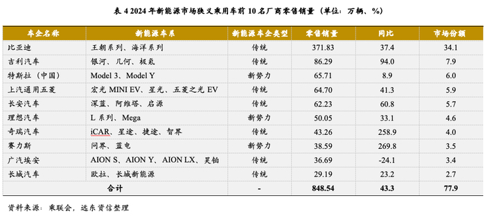 市场份额集中度层面,2024年全国新能源市场狭义乘用车前10名厂商零售销量848.54万辆,占当年新能源汽车销量份额的77.9%。传统车企凭借成本控制和销售渠道优势仍然占据新能源汽车市场主要份额,其中比亚迪凭借王朝系列和海洋系列车型依托性价比优势位居全市场第一名,销量占到全市场份额的34.1%。相较于其他新能源车企,比亚迪产量规模巨大,建有自营刀片电池工厂,在成本控制和技术独立性方面具备很强的综合竞争力。目前,新势力车企市场份额依旧偏低,前十大销售品牌中仅有特斯拉(中国)、理想、赛力斯入围。其中特斯拉(中国)销售增速明显放缓,2024年市场份额下降到全国第三名。由于美国、欧洲对中国新能源汽车政策尚不明朗,特斯拉(中国)境外销售受到一定冲击。2024年,理想汽车在插电混动和增程式车型上的开发力度有所下降,市场重心向以Mega为代表的纯电车型倾斜,全年销售增速33.1%,市场份额有所提升。赛力斯系传统车企基础上转型的新势力车企,以其与华为的深度合作和具备自有产能为经营亮点,2024年零售销量达到38.59万辆,同比增长269.8%,业绩实现扭亏为盈。