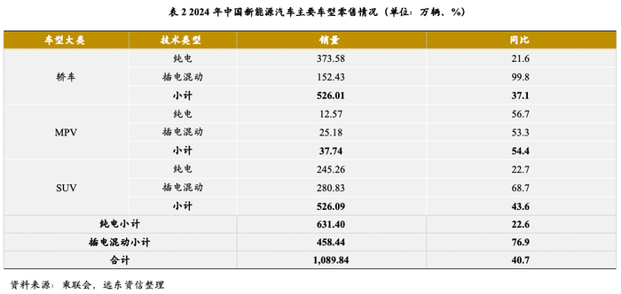 从销售车型大类来看,2024年全国零售新能源汽车中,SUV车型和轿车销量大致相当,MPV等商务车型销量较低,纯电车型成为消费者主要选择,插电混动车型销量增速也较快。目前,国内部分城市基于缓解拥堵等考量,对燃油车和新能源车采取了限购措施。SUV车型通常拥有更大的空间和更高的离地间隙,更适合家庭出行和户外活动,全年SUV销售增速高达68.7%,插电混动车型在缓解出行里程焦虑方面更具竞争力,销量远超纯电车型。相较于SUV,新能源轿车多应用于市内通勤,风阻和能耗方面具备先天优势,因此纯电车型销售绝对数量更高。