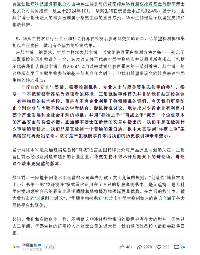 对此,华熙生物此次发文回应称,“鉴于热心网络水军的提醒,经过华熙生物核实,由郝宇担任法人代表的上海柳页医创医疗科技服务有限公司由华熙生物参与的海南海熙私募股权投资基金与郝宇相关公司共同投资,设立于2024年10月,华熙生物在该基金中占比32.4%。基于此,由郝宇担任法人的柳页医创属于华熙生态的重要成员,华熙生物理应予以坚定支持和依法保护”。