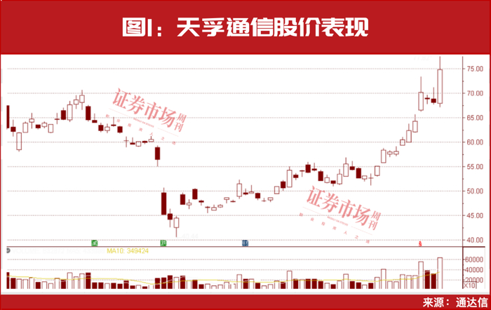 先来说一下板块宏观驱动的β机会,其中的重要代表为算力。今天的热点不少,其中,科技赛道看点很多,是上午盘的核心领涨主题之一。细分代表方向有CPO(共封装光学)、光通信、算力、铜缆高速连接等。从个股来看,天孚通信、中际旭创等概念股均大涨,开启了由低位放量突破模式,其中,天孚通信大涨10%(见图1)。仕佳光子等则处于相对高位的主升浪行情中,今天盘中也一度大幅冲高。