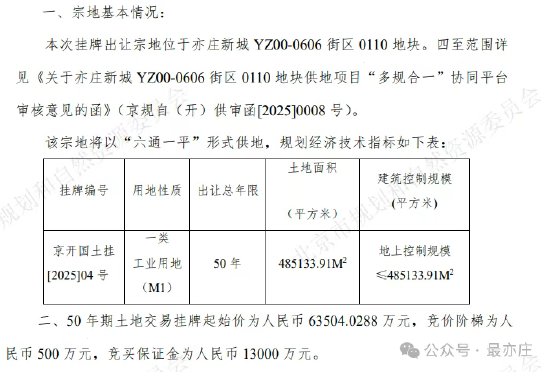 本次挂牌出让地位于北京市亦庄新城,该宗地将以“六通一平”形式供地,出让总年限为50年,挂牌起始价为63504.0288万元,竞价阶梯500万元,竟买保证金1.3亿元,竞得人是小米景曦科技有限公司。