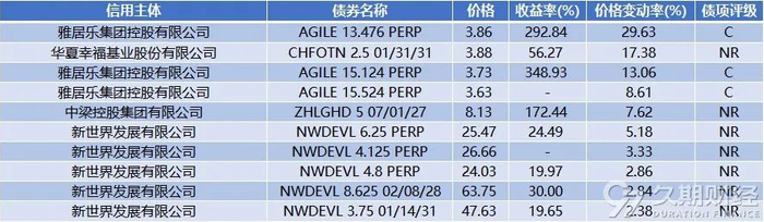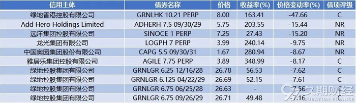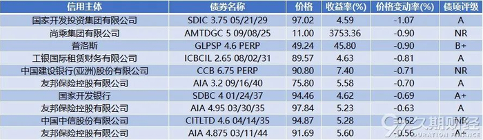 地产板块方面,雅居乐AGILE 15.524 PERP(240万美元),盈大地产PCPDC 5.125 06/18/26(200万美元),万科企业VNKRLE 3.975 11/09/27(170万美元)。