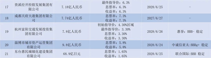 安庆滨江控股发行4.15亿人民币债券,票面利率6.5%,本次为该公司今年以来发行的第二期点心债,获得超8倍认购。东台惠民城镇建设集团发行68.9亿日元债券,息票率1.65%。据久期财经数据,本次是该公司时隔三年再次发行境外债,也是公司首只日元计价债券,由江苏银行提供SBLC。