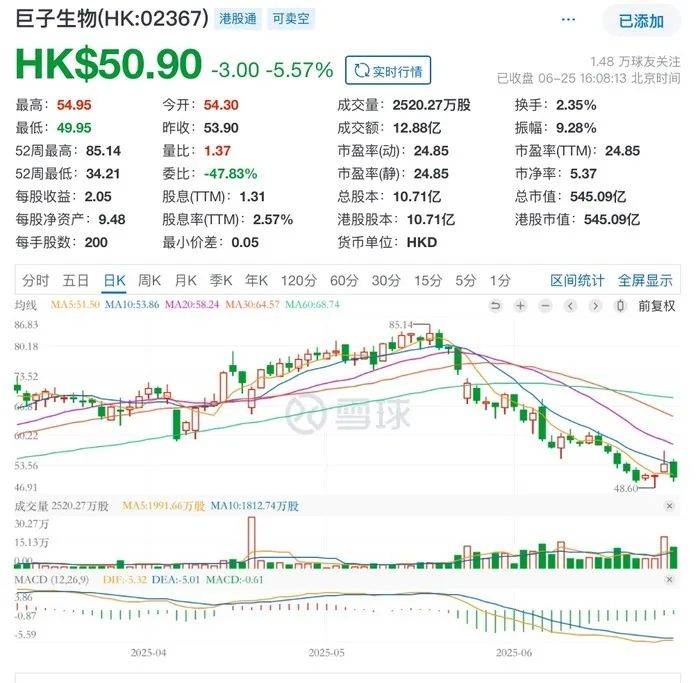 资本市场的反应更为剧烈和直接。自5月24日事件爆发后,巨子生物股价一路下行,从彼时约87港元/股的高位,跌至目前的54港元/股左右,市值从超900亿港元蒸发至不足600亿港元,累计跌幅近四成,超过330亿港元市值化为乌有。