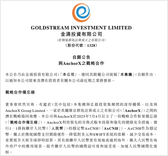 根据公告,金涌投资与AnchorX的合作方向,是离岸人民币稳定币AxCNH的应用。