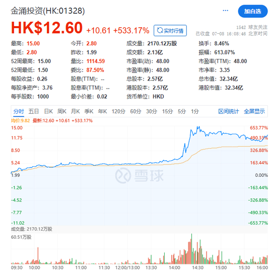 7月8日,港股金涌投资盘中股价一度涨超650%,创下近年来罕见涨幅。
